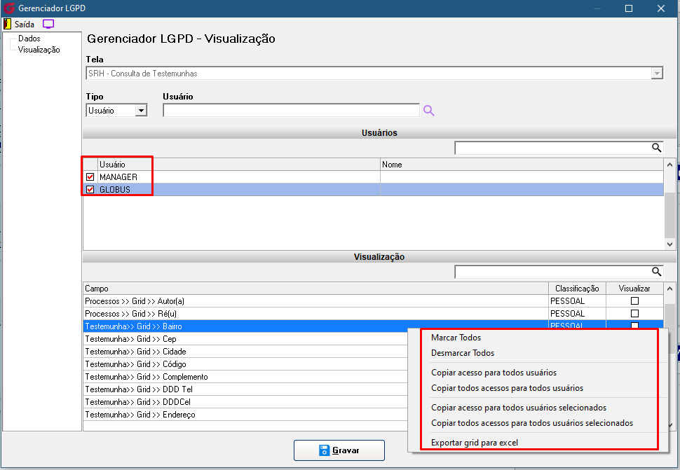 Na opção Visualização, no grid usuários com botão direito do mouse, temos as opções: