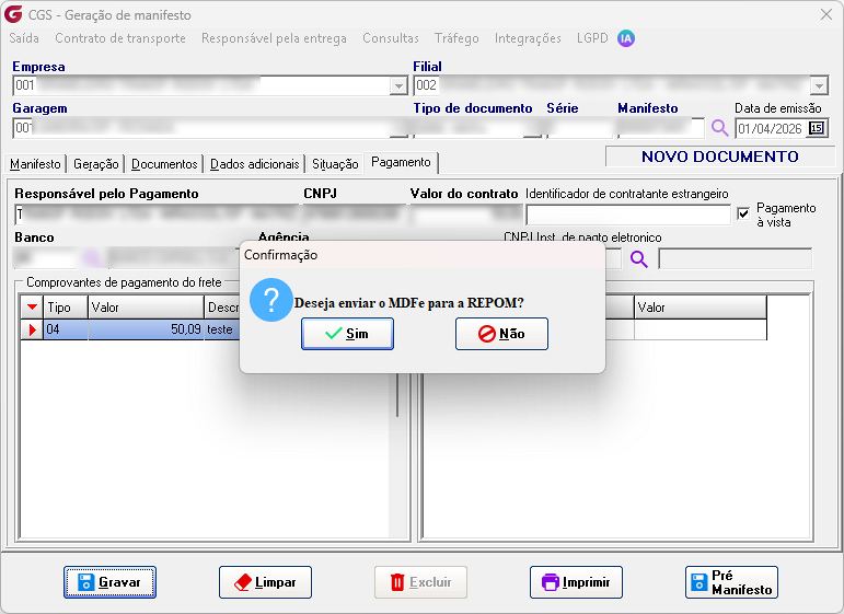 Observação: Por se tratar de um ambiente de homologação, não foi possível estabelecer a conexão (devido à indisponibilidade da Repom), fazendo com que os campos permanecessem zerados.
