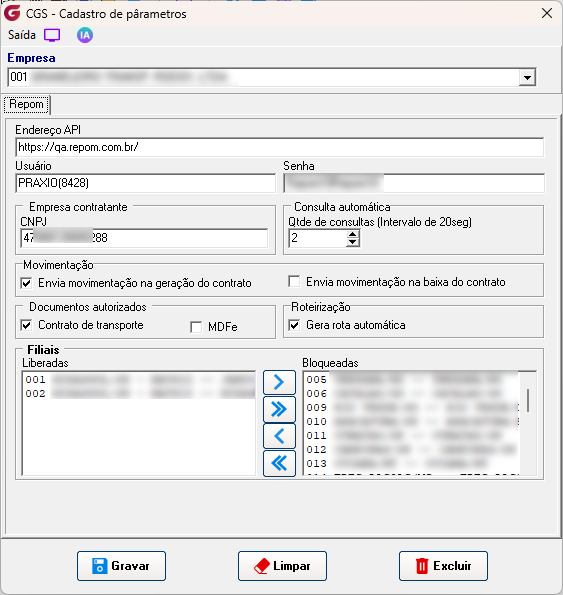 Permite associar as filiais autorizadas ou bloqueadas para realizar a integração com a Repom.