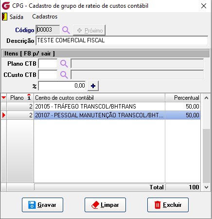 No exemplo acima o rateio foi feito 50% para cada despesa.