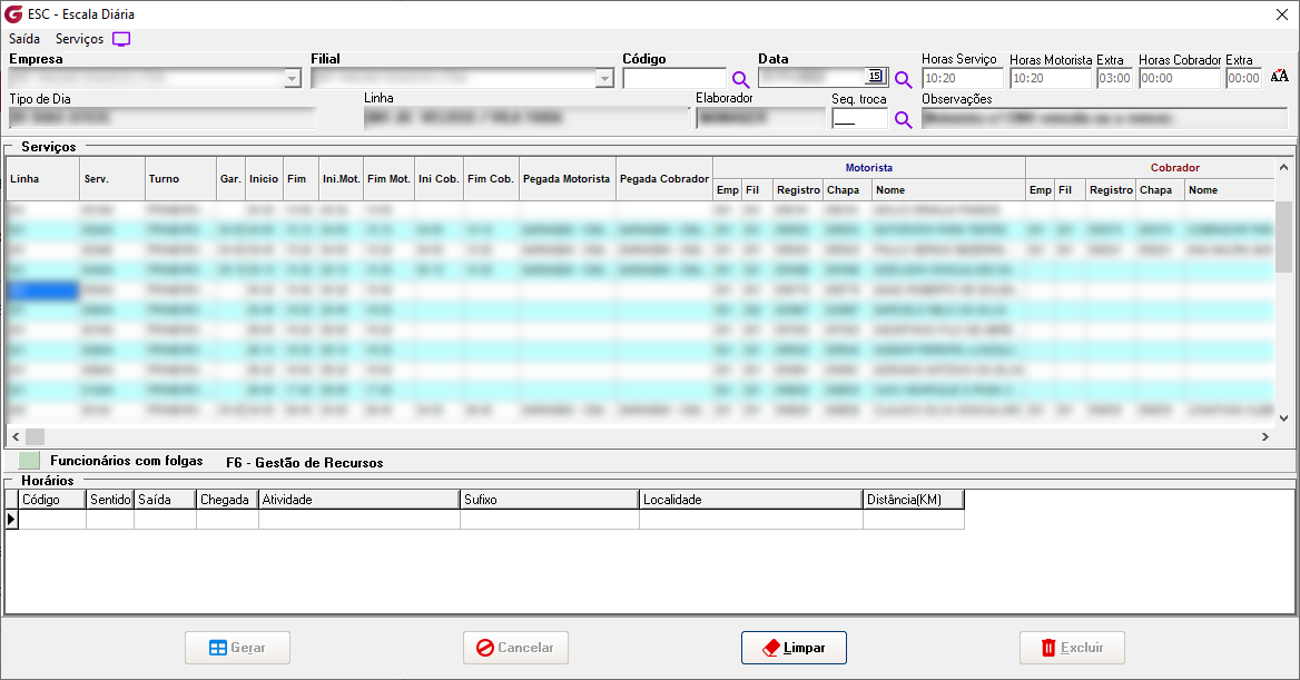 A Tela de Gestão de Recursos irá retornar as informações sobre status de funcionários e veículos na Escala Diária e nas Grades de Funcionários por Linha, Grade de Linha por Funcionários. O Grid de Controle de Horas dos Serviços é um recurso visual que auxilia o usuário com informações sobre as horas referentes ao serviço apontado no grid.
