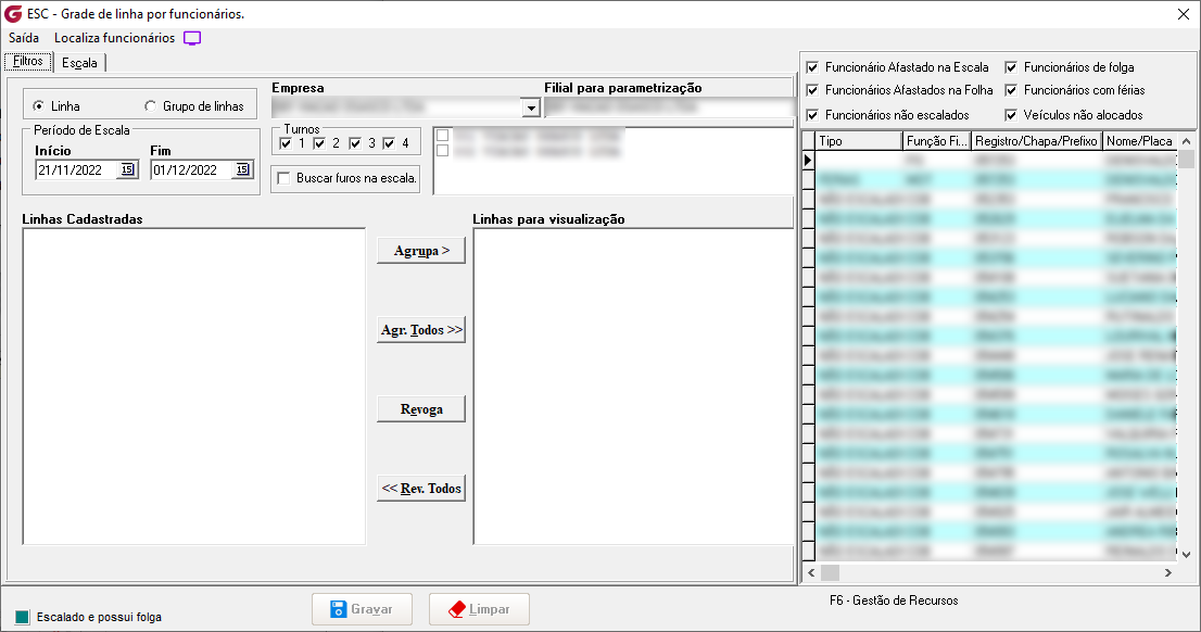 A tela de gestão de recursos trabalha com parametrização de filtros, foram disponibilizados seis filtros, Funcionários Afastados na Escala, Funcionários Afastados na Folha, Funcionários não Escalados, Funcionários de Folga, Funcionários com Férias e Veículos não Alocados. Esses filtros estão disponíveis na parte superior da tela, para serem visualizados no grid basta deixar a flag marcada do recurso que deseja consultar, ao serem filtrados, os recursos apareceram na tela, e ficaram disponíveis para o usuário a visualização e movimentação desses recursos.