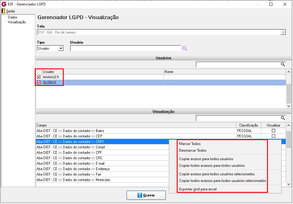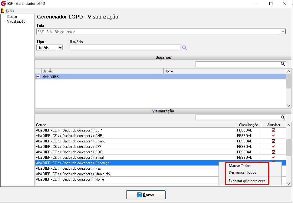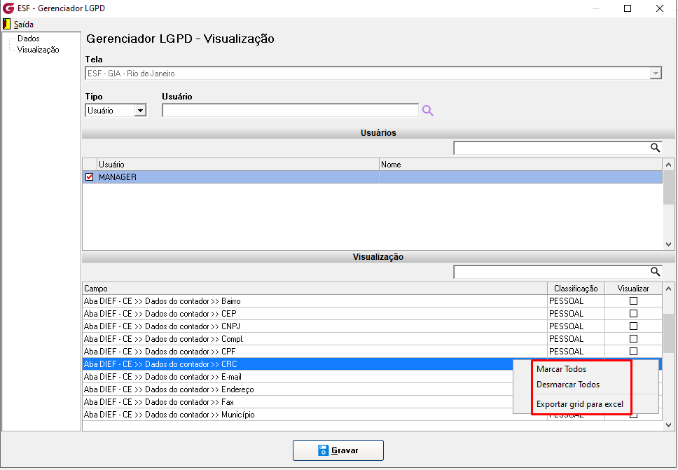 No menu Gerenciador, o responsável poderá configurar a classificação e a visibilidade de cada campo da tela. Serão exibidos todos os campos que possuem ser pessoais e/ou sensíveis, permitindo ao usuário autorizado gerenciar essas configurações conforme necessário, inclusive personalizando as permissões de visualização por usuário ou grupo.