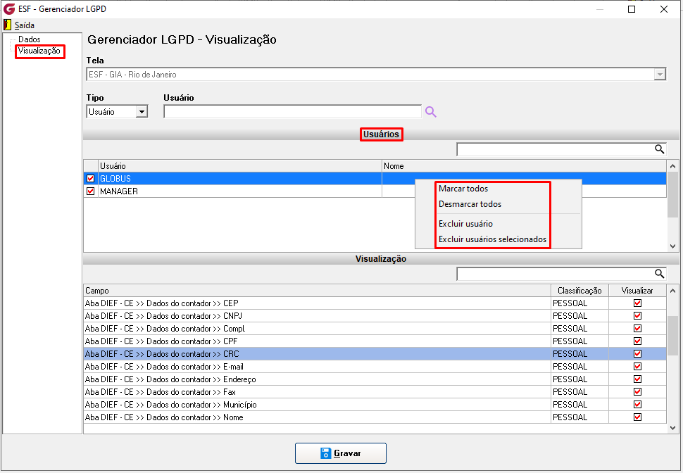 - Excluir usuário – exclui as visualizações alteradas para o usuário marcado e este usuário volta à visualização padrão Globus.