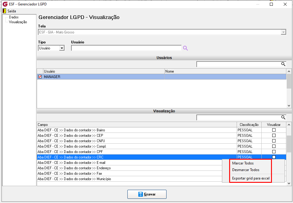 No menu Gerenciador, o responsável poderá configurar a classificação e a visibilidade de cada campo da tela. Serão exibidos todos os campos que possuem ser pessoais e/ou sensíveis, permitindo ao usuário autorizado gerenciar essas configurações conforme necessário, inclusive personalizando as permissões de visualização por usuário ou grupo.