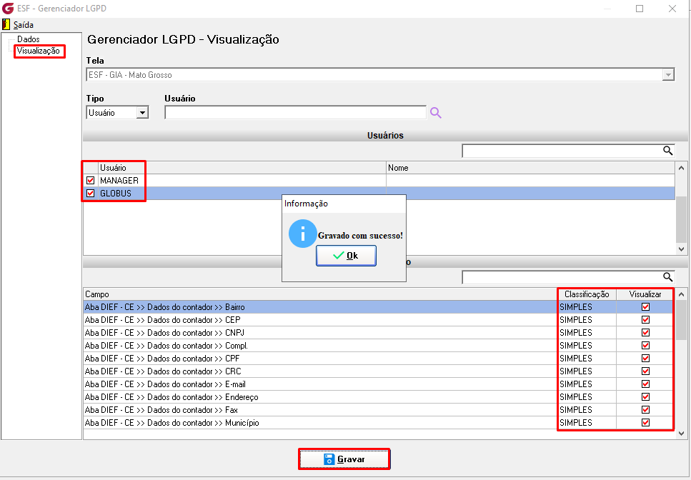 Após essa configuração, na aba Visualização, será possível verificar que todos os usuários selecionados terão a visualização ativa para os campos classificados como SIMPLES na aba "Dados".