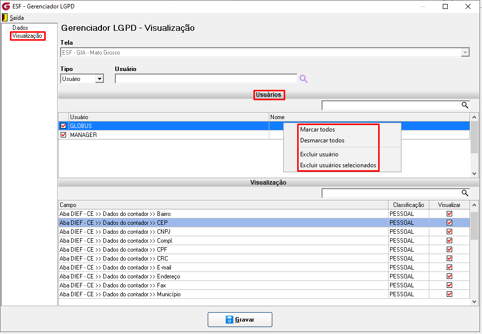 - Excluir usuário – exclui as visualizações alteradas para o usuário marcado e este usuário volta à visualização padrão Globus.