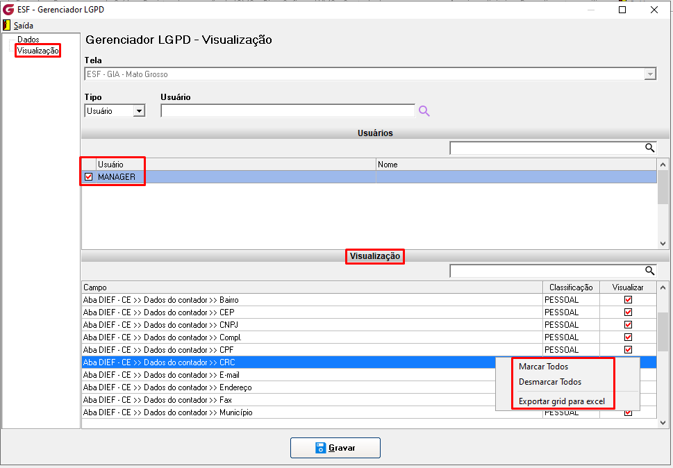 - Marcar Todos – marca o botão visualizar de todos os campos do grid para o usuário.