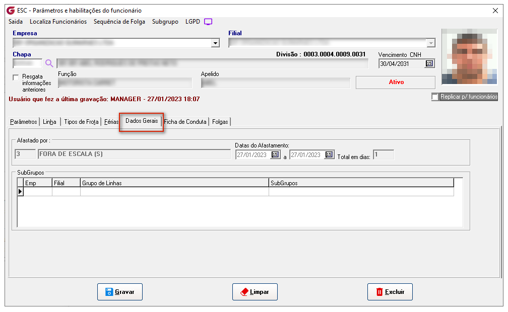 Na Aba de Dados Gerais o usuário pode verificar informações como Afastamentos e SubGrupos, informações vinculadas ao funcionário em algum momento e que podem auxiliar o usuário nas tomadas de decisão com relação a rotina deste funcionário.