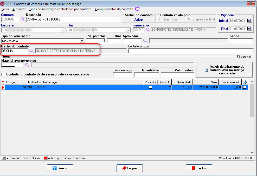 Na tela de cadastro de contrato de compra para material avulso/serviço, é obrigatória a inclusão de um usuário Globus com o gestor do contrato.