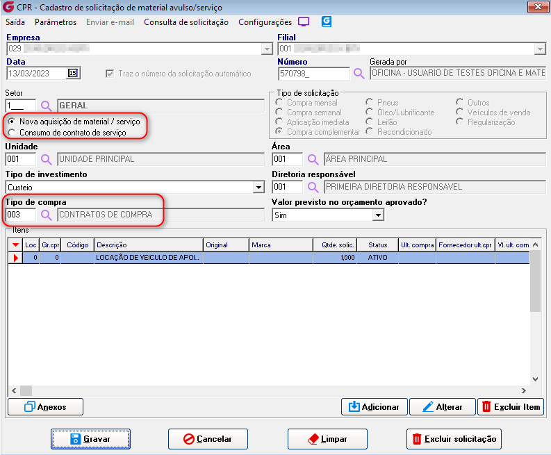 Quando na solicitação for marcado consumo do contrato de serviço, na tela de adição de itens, é solicitada a pesquisa do número de contrato, esta pesquisa traz apenas contratos de serviços.
