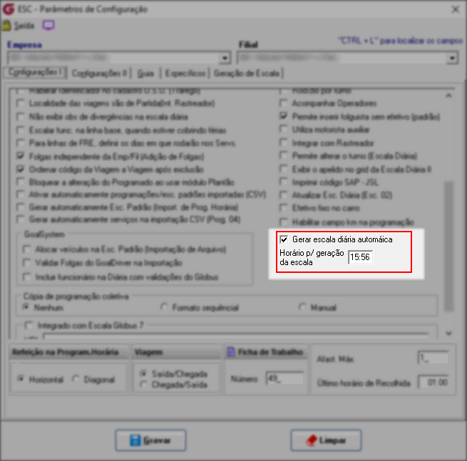 Na tela de parâmetros e configuração foi implementado o parâmetro (Gerar Escala Diária Automática) e campo de hora que deve ser gerado a escala de forma automática. Uma vez marcada essa opção o sistema irá gerar escala para o próximo dia D+1 de forma automática, sendo assim respeitando o tipo de dia da escala.