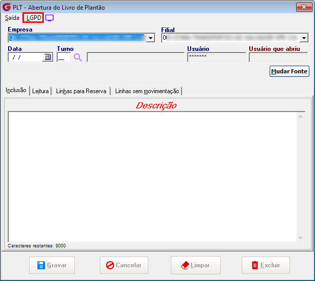 Restringir a visualização nível a campo da tela de Abertura do Livro de Plantão no menu LGPD. |