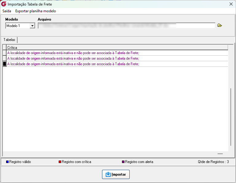 • Atualmente a rotina só permite cadastro de tabelas com valores fixos, verifique se o modelo de planilha utilizado está em conformidade da exigência do sistema. • Caso a localidade de origem e/ou destino estejam inativas no sistema, no momento da importação da Tabela de Frete, o sistema realizará a validação do status da localidade e impedirá a associação, apresentando ao usuário a seguinte mensagem informativa: |