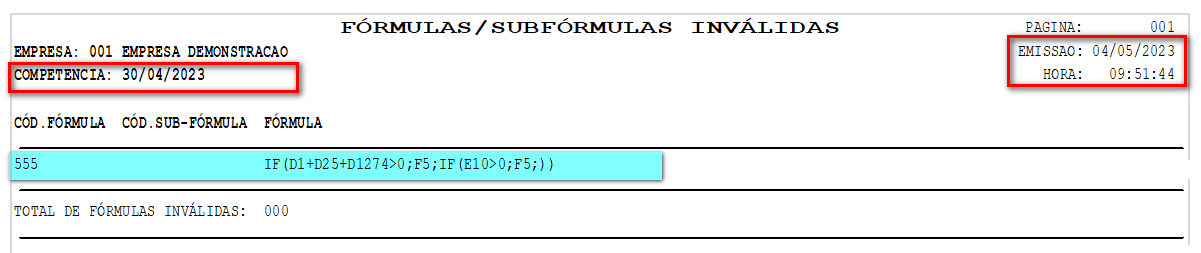 Ao clicar em SIM que deseja emitir a listagem, o sistema demonstra qual a fórmula que se encontra invalida: