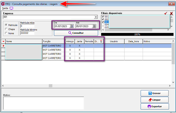 - BROWSER DE PESQUISA– Será disponibilizado no GRID somente funcionários que tenham alguma parametrização do cadastro de diária de viagem