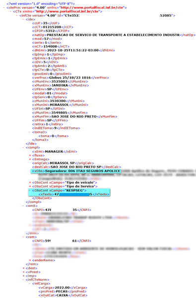 Importante: A informação do responsável pelo seguro no XML e no DACTE, é enviada no XML e impressa no DACTE de 02(duas formas):