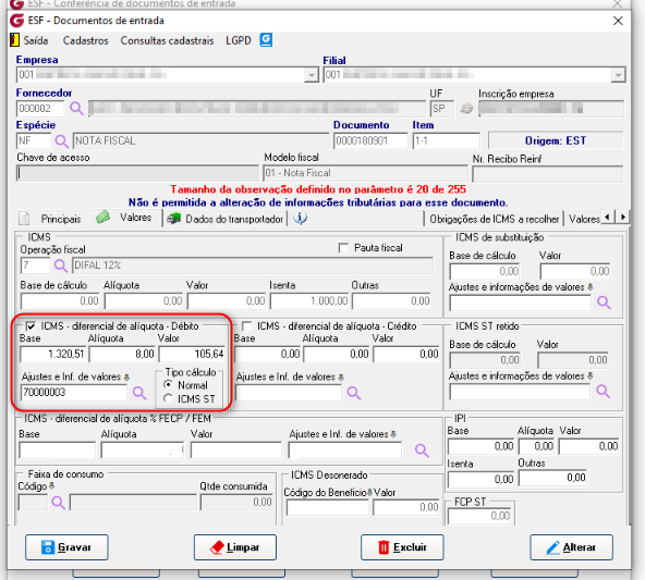 Diários>Entradas>Por nota fiscal Valor do item = 1.000,00 Alíquota item = 12% ICMS do item = 120,00 Valor da base do DIFAL = Valor do ítem multiplicado por índice fixo de 1,320513 1.000,00 x 1,320513 = Base do DIFAL = 1.320,51 Alíquota do DIFAL = alíquota fixa de 8% Alíquota do DIFAL = 8% Valor do DIFAL (base do DIFAL x alíquota do DIFAL ) 1320,51 x 0,08 = 105,64 Escrituração>Documentos de entrada>Conferência de documentos Parâmetro para validação da utilização de cálculo DIFAL com valor no campo "Aliquota de combate à pobreza" e opção "Cálculo DIFAL com base dupla" marcada.
