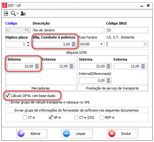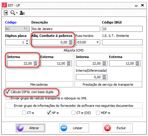 Atualizado cálculo da base de débito do diferencial de alíquota para entrada de notas fiscais no estado do Rio de Janeiro, para atender à nova legislação. Cadastros>Controle>UF Parâmetro para validação da utilização de cálculo DIFAL com valor zero no campo "Aliquota de combate à pobreza" e com a opção "Cálculo DIFAL com base dupla" marcada.