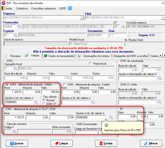 Diários>Entradas>Por nota fiscal Valor do item = 1.000,00 Alíquota item = 12% ICMS do item = 120,00 Base de cálculo RJ (valor do item - ICMS do item) 1.000,00 - 120,00 = 880,00