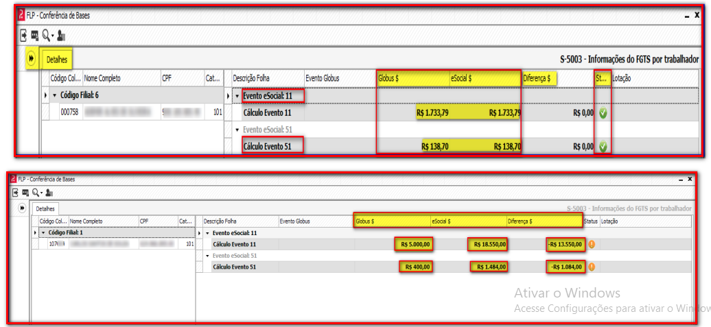 Rotinas Auxiliares >> eSocial>> Conferencia de Base: Nos exemplo abaixo os valores do Globus e do eSocial estão iguais e no outro caso há uma diferença. Assim é necessário conferir os eventos de Folha de Pagamento.