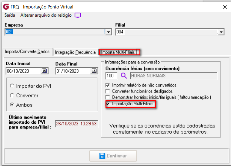 Demonstrar a funcionalidade do novo parâmetro para importar multi-filiais na Importação Ponto Virtual e criado um 'Check' na Importação Relógio de Ponto para não sobrepor registros que foram alterados de origem PVI. |