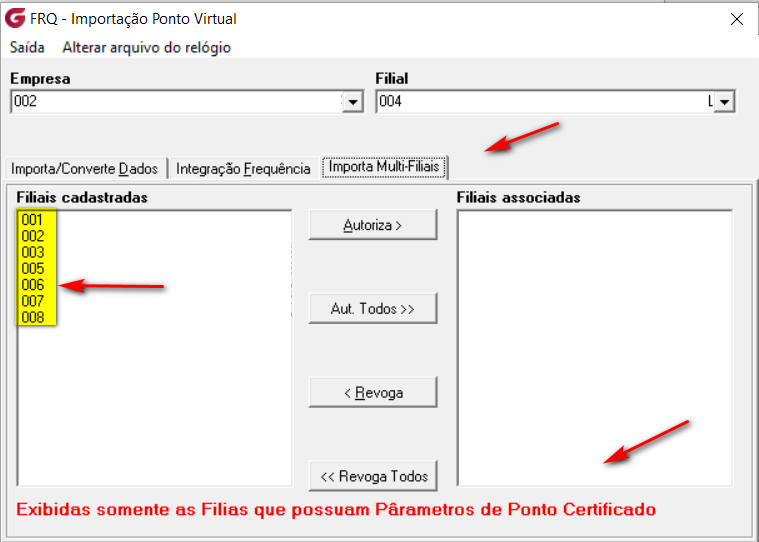 1º Implementação: Na Tela de Importação Ponto Virtual, se marcar o 'Check' 'Importação Multi-Filiais', será habilitada uma aba para selecionar as filiais que deverão ser importadas: