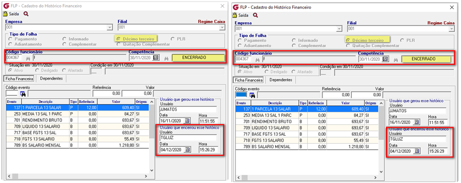 Bem como demonstrado no LOG a exclusão da competência dos dois funcionários.