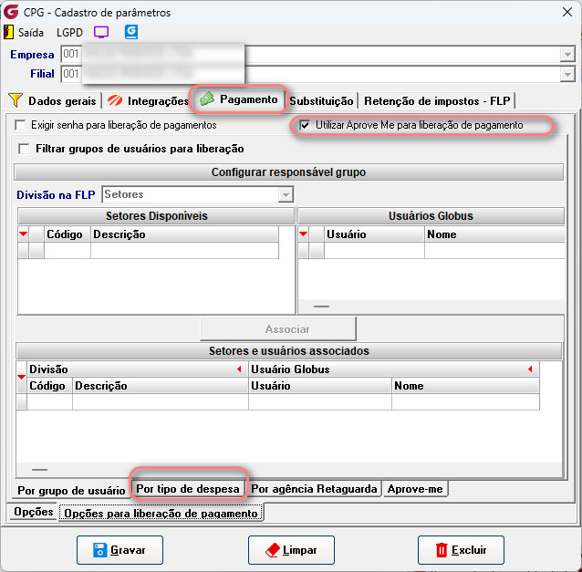 Passo 2: Marcar o flag “Utilizar Aprove-me para liberação de pagamento” e definir o usuário (por grupo de usuário, por tipo de despesa ou por agência Retaguarda)