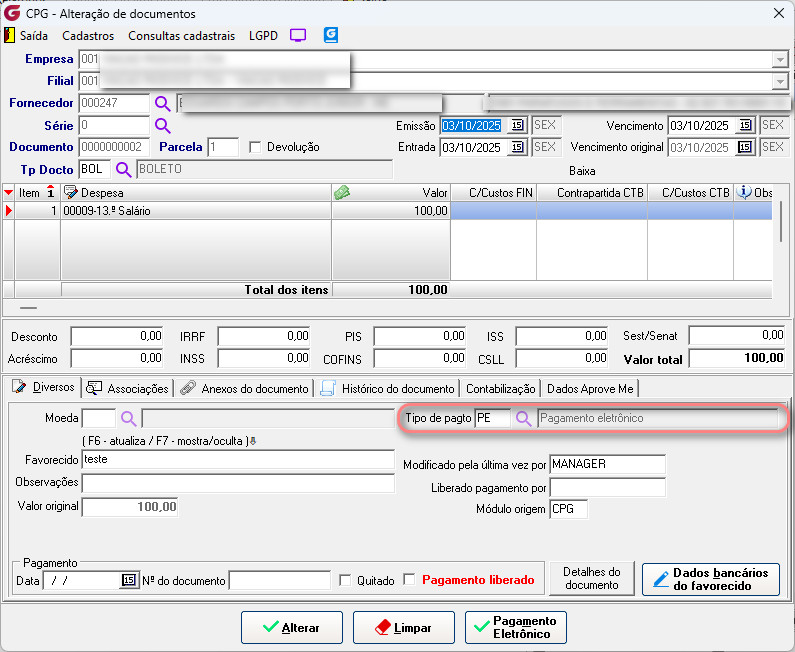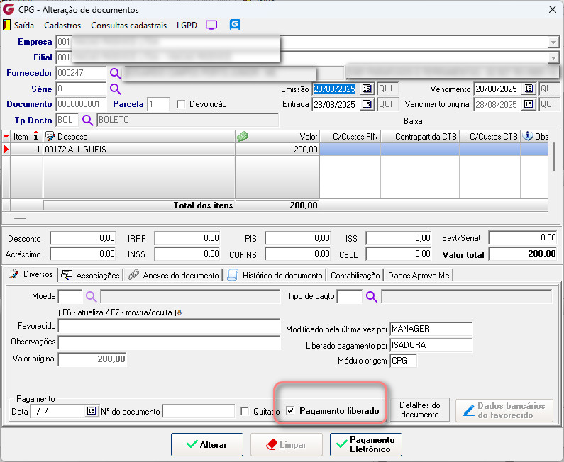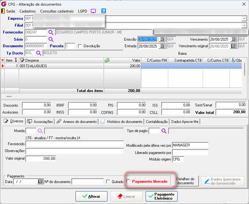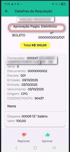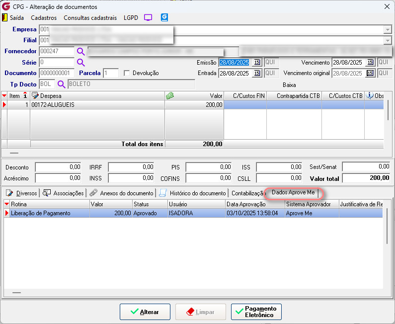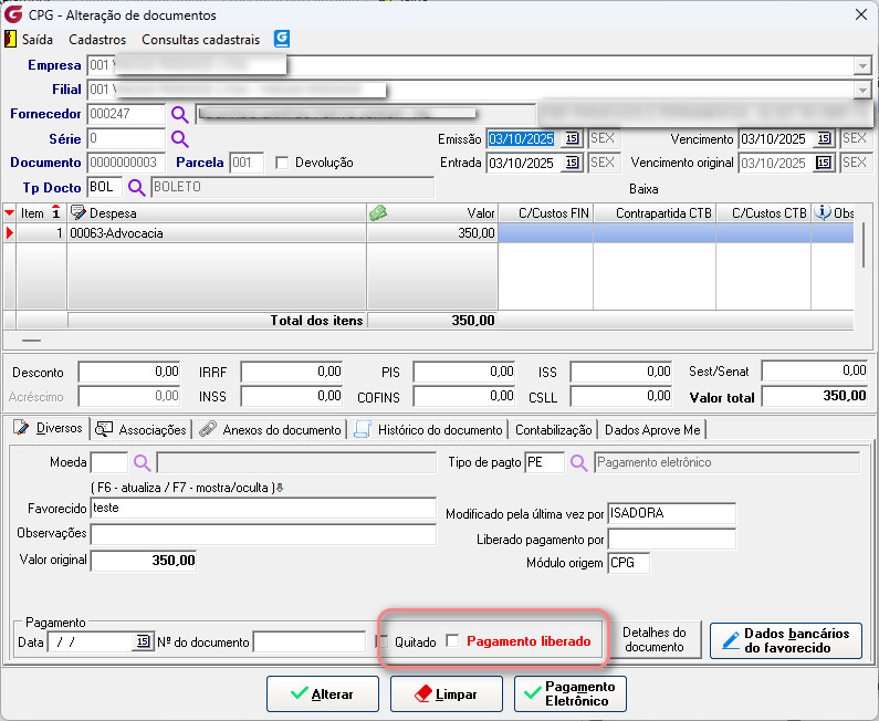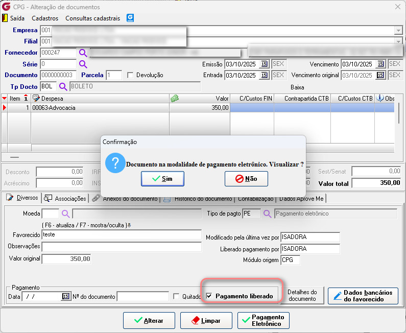 Após essa aprovação, o documento ficará liberado para definição do Pagamento Eletrônico: