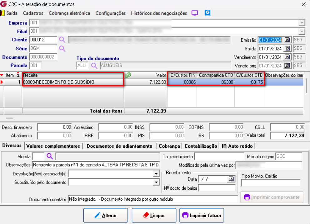1) Inclusão do contrato Implementado para que o usuário consiga alterar o tipo de documento e tipo de receita dos contratos comerciais a receber. Além disso, adicionamos os campos Cp CTB (Contrapartida contábil) e CC CTB (Centro de custo contábil) para que o usuário possa incluir ou alterar os dados. Abaixo exemplo de um contrato com tipo de receita diferente do que foi cadastrado nos parâmetros: Parâmetros GCC