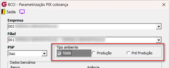Passo 1: Ao informar empresa e filial e escolher o PSP (Banco).
