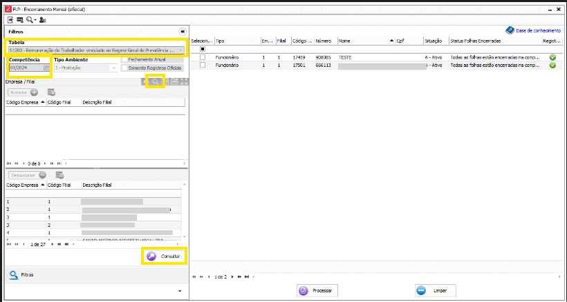 Nesse menu você terá a opção de processar um ou mais registros de uma determinada tabela por vez. Acesso ao Menu: Procedimentos Mensais – Encerramento Mensal (eSocial) S1200 - Remuneração de trabalhador vinculado ao Regime Geral de Previdência Social Para disparar os registros na S1200, primeiro é necessário que você faça o encerramento das Folhas de Pagamento de funcionários, Estagiários, Autônomos e Pró-labores (cada um deles individualmente) no menu: Procedimentos mensais > Encerramento Mensal ( para funcionários). E no menu: Procedimentos mensais > Encerramento Mensal ( Pró Labores / Autônomos). A Folha de Pagamento é gerada por CPF e este procedimento se faz necessário, pois só pode ser enviada uma única S1200 por competência por CPF, e caso o CPF tenha mais de uma Folha na mesma competência (inclusive as complementares), todas as informações seguirão dentro do mesmo XML. IMPORTANTE: Esta rotina somente deve ser executada quando todos os cálculos estiverem devidamente conferidos para a geração e envio da S1200. Ao abrir o menu deverá ser selecionada a tabela que deseja enviar, e preenchido o campo 'Competência'. O campo 'Tipo de Ambiente' sempre será 1 - Produção. No campo de baixo você vai clicar na lupa, para que seja carregado na tela as empresas e filiais. Após a tela ser carregada com as empresas e filiais você vai selecionar a que deseja enviar a informação, e vai clicar no botão 'Consultar'. Ao consultar os registros irão aparecer do lado direito da tela.