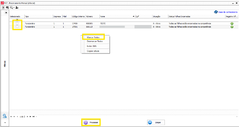Ao aparecer os registros na tela, você terá duas formas de liberar eles para envio. A primeira seria selecionando cada um no quadradinho na frente do nome do funcionário, e a segunda seria selecionando apenas um registro, e clicando com o botão direito, aonde vai aparecer a opção 'Marcar todos'. Após selecionar os registros é necessário clicar no botão 'Processar' para que os registros sejam liberados para envio no Gerenciador do eSocial.