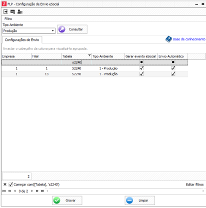 https://webservices.producaorestrita.esocial.gov.br/servicos/empregador/consultarloteeve ntos/WsConsultarLoteEventos.svc Observação: Para enviar ao eSocial em ambiente de Produção Restrita e /ou de Produção, será necessário realizar a parametrização dos envios das tabelas/eventos no menu: Rotinas auxiliares > eSocial> configuração de envio eSocia ![]() Você vai marcar a tabela S2240 nas duas opções “Gerar evento eSocial” e “Envio Automático”. Após clicar em Gravar.