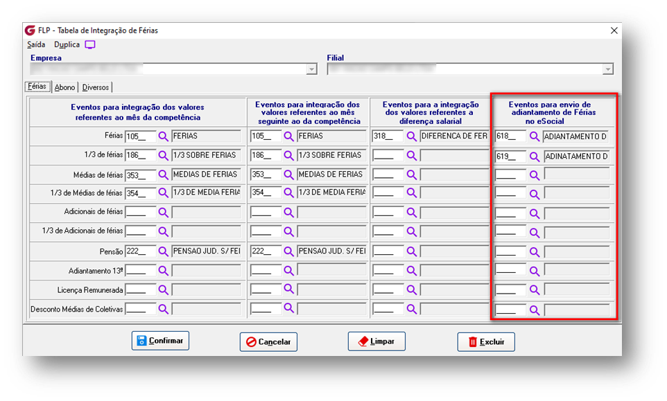 Tabela de Integração de Férias Passo 1: No módulo de Folha, caminho: Férias > Recibo de Férias > Tabela de Integração, abrirá a tela de Tabela de Integração de Férias, nesta tela, foi incluído a coluna 'Eventos para envio de Adiantamento de férias no eSocial'. Deve-se cadastrar nesta coluna os eventos a serem enviados para o eSocial como Adiantamento de Férias.