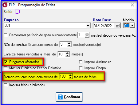 Se marcado a opção 'Programar Afastados' o campo 'Demonstrar afastados com menos de (xxx) meses de férias' deverá ser preenchido.