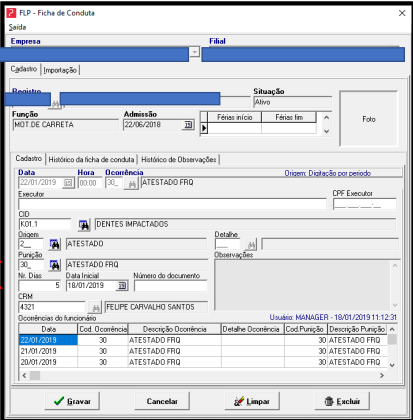 Menu: Cadastros > Funcionários > Ficha de Conduta