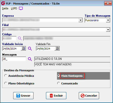 Destino da Mensagem: A mensagem pode ser direcionada sobre Assistência Médica, Mais Vantagens, Plano Odontológico e Comunicado.