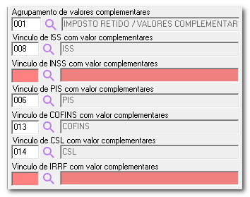 Exemplo de tipo de documento (NFS) configurado para utilizar valores complementares (Menu Cadastros >> Contas a Receber >> Tipos de documentos) Caso o tipo de documento esteja com a flag desmarcada, a integração fiscal da nota e seus respectivos impostos será feita normalmente sem preencher a tabela do módulo fiscal responsável por guardar os valores complementares. Parâmetros da Agência Considerando o exemplo anterior de um documento com a flag marcada, o ideal é que o usuário faça o vínculo de todos os campos da área destacada no exemplo abaixo, começando pelo agrupamento (em verde) e os demais tributos (em azul).