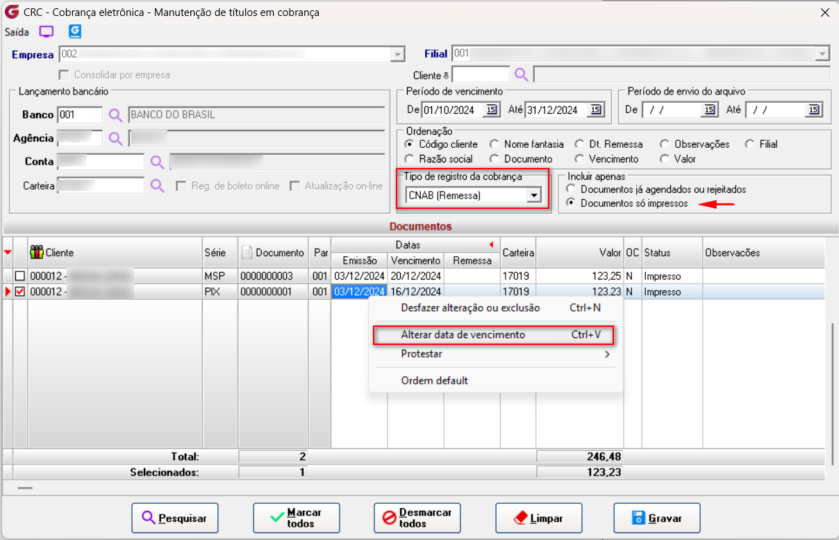 Após alterar o vencimento, vamos em cada documento com o botão direito do mouse e marcamos a opção "Alterar documento em cobrança".