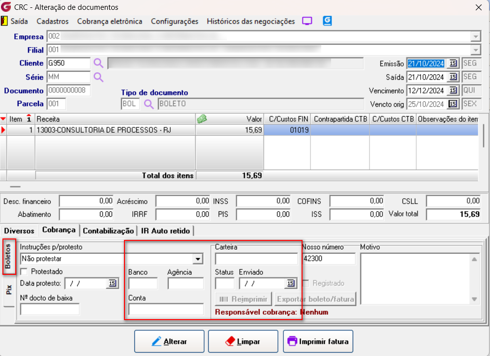 O Tipo de registro cobrança Pix tem as mesmas validações que o Boleto online, permitindo manutenção para documentos com emissão de Fatura com QR Code ou QR Code avulso, quando gerado somente o QR Code pela tela de alteração de documentos.