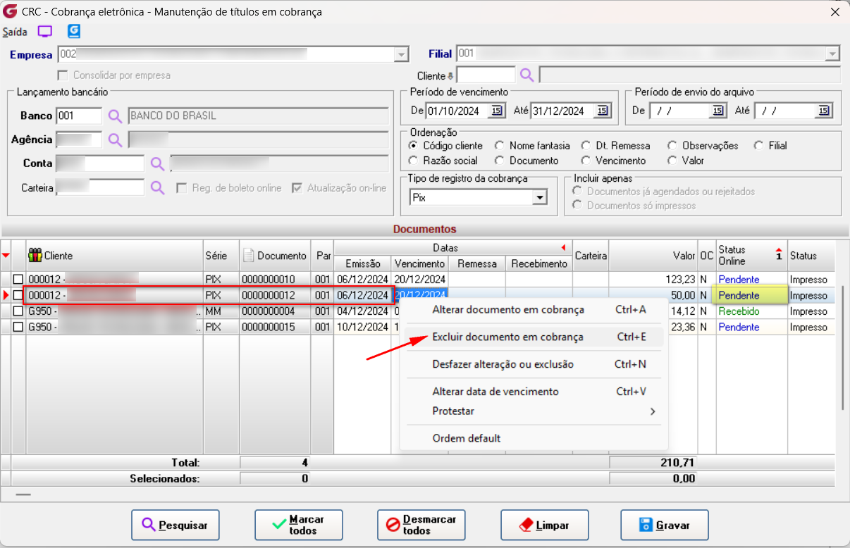 Para Status online = Pendente, usamos a opção com botão direito do mouse e escolhemos "Excluir documento em cobrança".