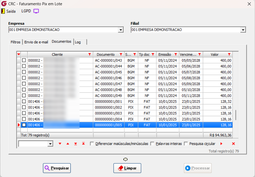 Obs.: Como se trata de cobrança via PIX com QR Code só podem ser gerados com data de vencimento igual ou superior a data atual, por esse motivo o sistema não traz documentos com data anterior.