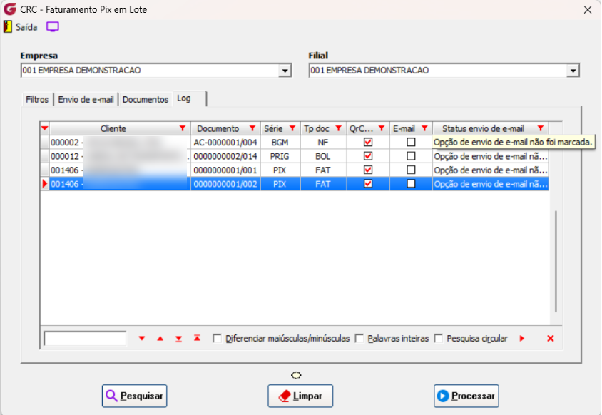 Ao finalizar temos no Log, a visão do que foi gerado e o que teve envio de e-mail, no caso do cliente 001406, foi gerado apenas o QR Code sem envio do e-mail, por falta de cadastro no cliente.