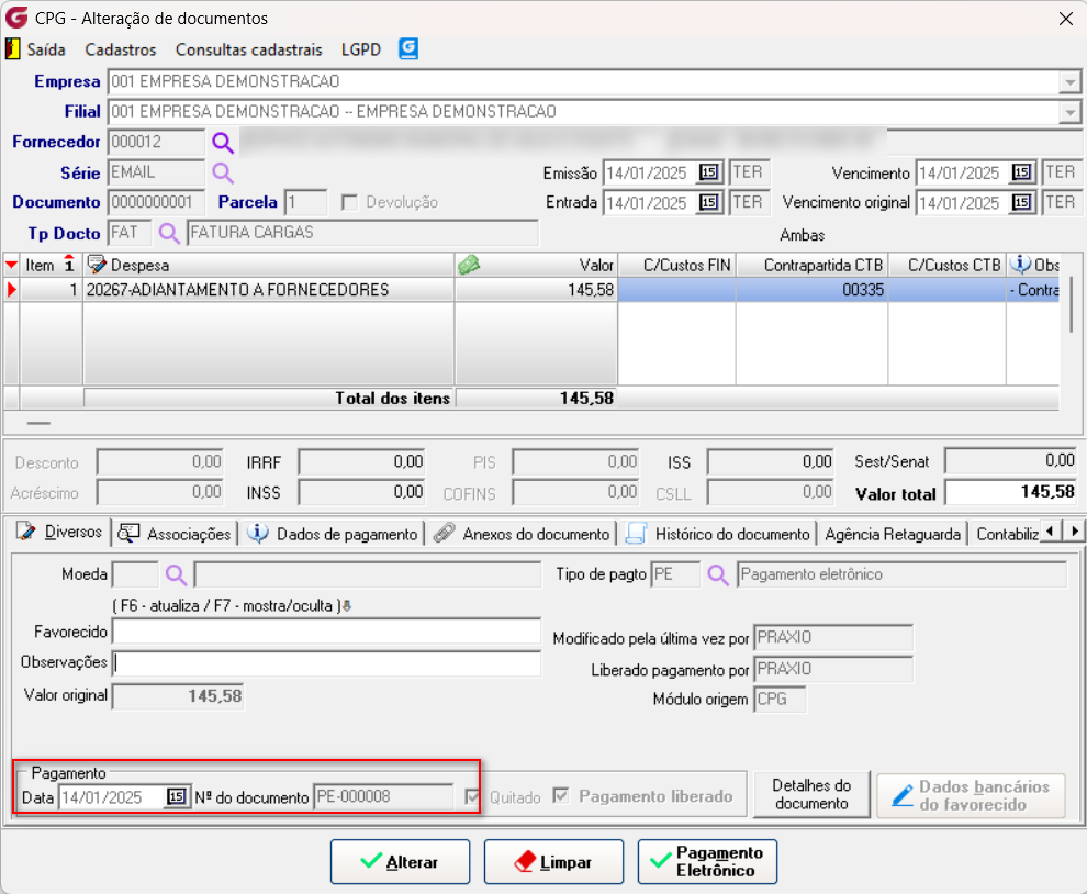 Quando agendado o documento fica da seguinte forma, é preenchido a data de pagamento: