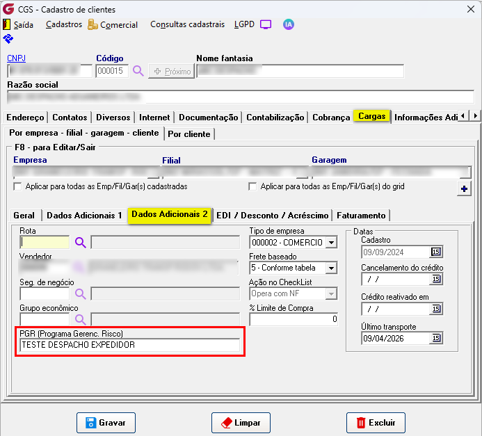 Ou seja, ao realizar o envio para a Apisul, sempre que esse cliente estiver no documento como remetente/expedidor ou destinatário/recebedor, o sistema irá considerar o valor informado no campo PGR.