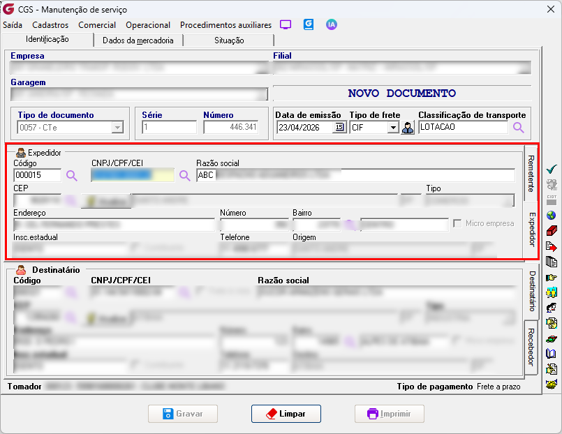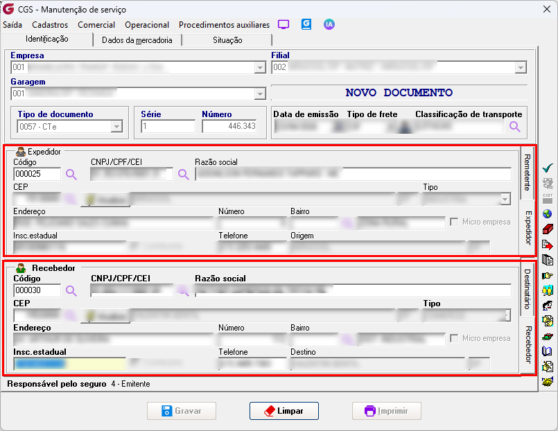 Sempre que o documento possuir expedidor e/ou recebedor informados, esses dados desses clientes serão utilizados como pontos na integração. Nessa situação, o sistema prioriza essas informações e, portanto, os dados de remetente e destinatário serão substituídos e enviados no XML.
