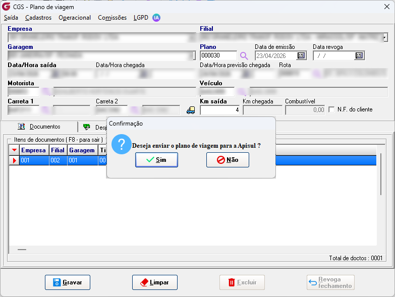 Após realizar as configurações necessárias, ao emitir o Plano de Viagem, o sistema apresentará uma mensagem em tela perguntando se deseja enviar a SMP para a Apisul.