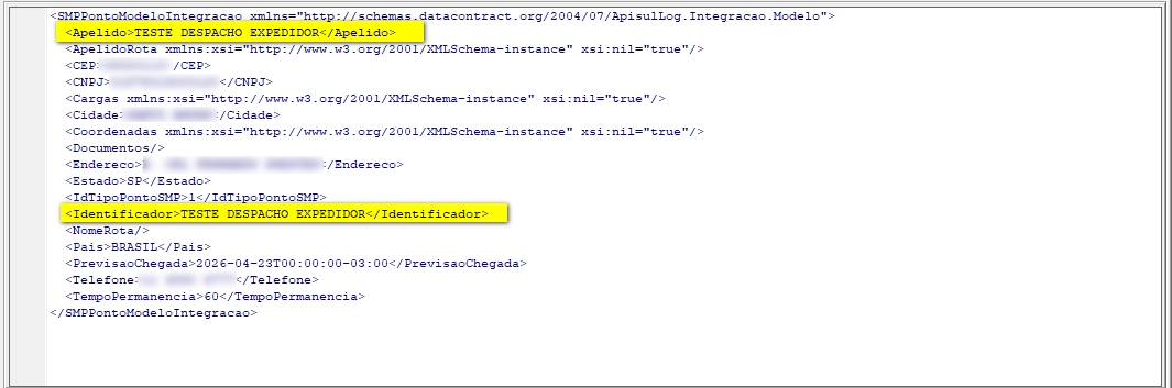 Ao realizar o envio e conferir o XML enviado para a Apisul, os pontos serão apresentados conforme o expedidor e recebedor do documento associado.